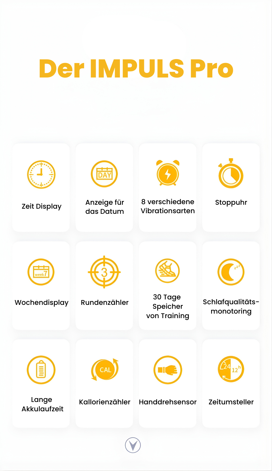 Der Impulse Pro ist ein Alarmarmband, das bequem am Handgelenk getragen wird und per Vibration zuverlässig weckt, ohne andere zu stören. Er zeigt die Uhrzeit, das Datum und den Wochentag an und lässt sich einfach bedienen. Zusätzlich verfügt das Armband über verschiedene Vibrationsarten, eine Stoppuhr sowie einen Schritt- und Kalorienzähler. Trainingsdaten können bis zu 30 Tage gespeichert werden. Ein integriertes Schlafmonitoring gibt einen Überblick über die Schlafqualität. Dank der langen Akkulaufzeit, der klaren Anzeige und des angenehmen Tragegefühls eignet sich der Impulse Pro gut für den täglichen Gebrauch und unterstützt einen strukturierten und aktiven Alltag.